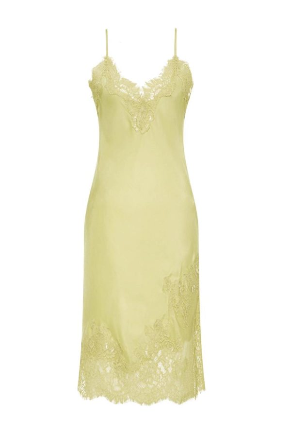 Silk midlength slip dress with adjustable straps and finished with lace on the neckline and hem. This dress has a leg slit on the left side.
