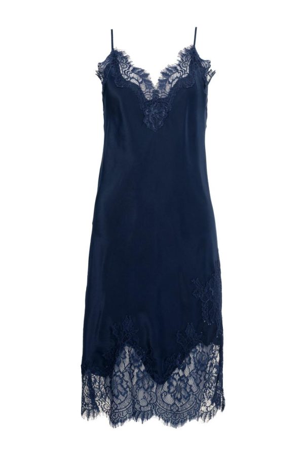 Silk midlength slip dress with adjustable straps and finished with lace on the neckline and hem. This dress has a leg slit on the left side.