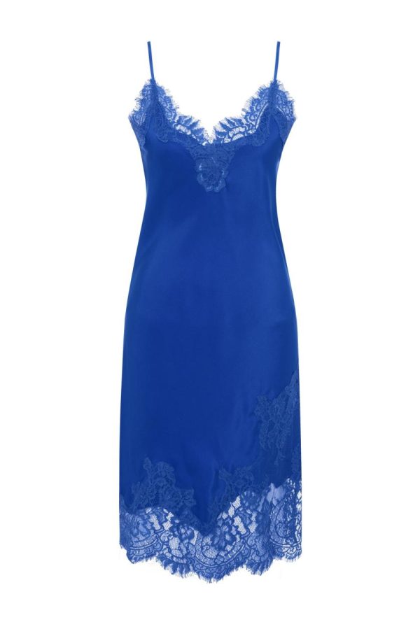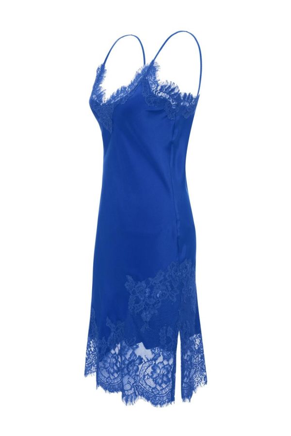 Silk midlength slip dress with adjustable straps and finished with lace on the neckline and hem. This dress has a leg slit on the left side.