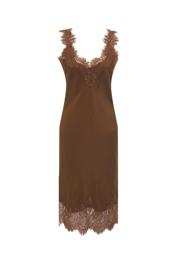 Silk midi / knee length dress cut on the bias and finished with our signature Coco lace on the hem, necklines, and straps. Bra-friendly. One of our favorites to layer with!