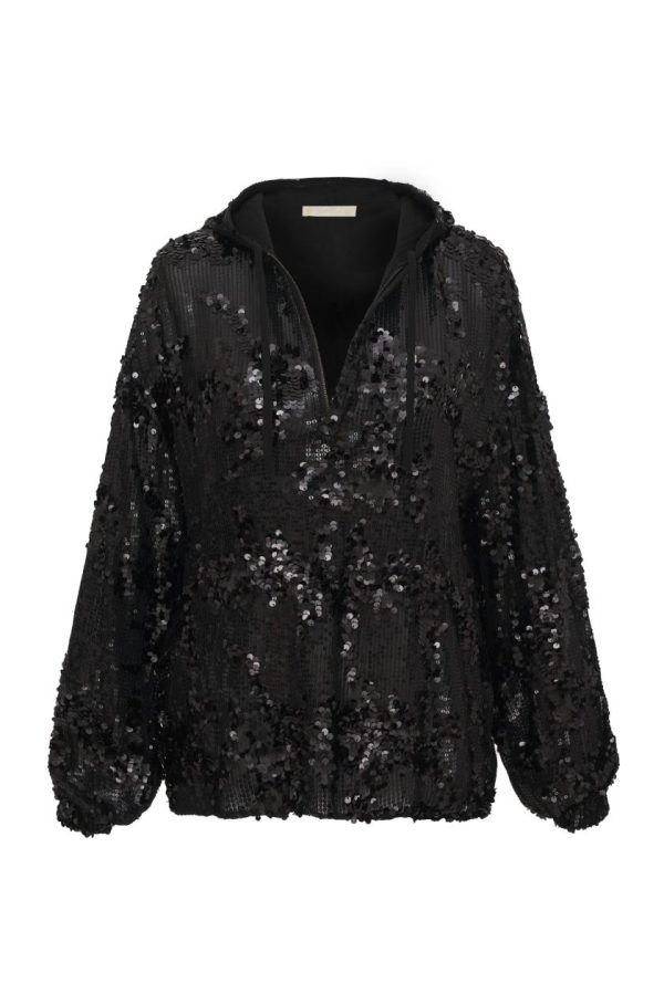 Luxe hand embellished sequins of multiple sizes adorn this half zip up hoodie jacket. The jacket is lined, has two front pockets, a drawstring hoodie, and elastic in the wrist cuffs. The fit is oversized.