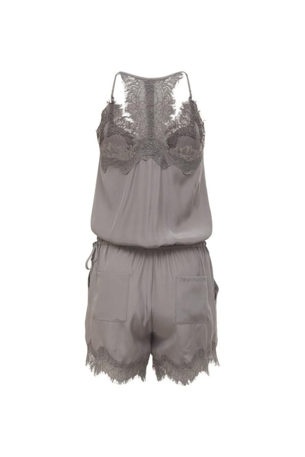 Romper with elastic waist and adjustable straps. It is embellished with lace on the upper back, around the neckline, and leg hems.