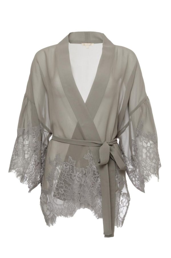 Silk georgette short kimono with lace detail at hem and cuffs. This kimono comes with a matching belt. Drape over your outfit to add some zhoosh.