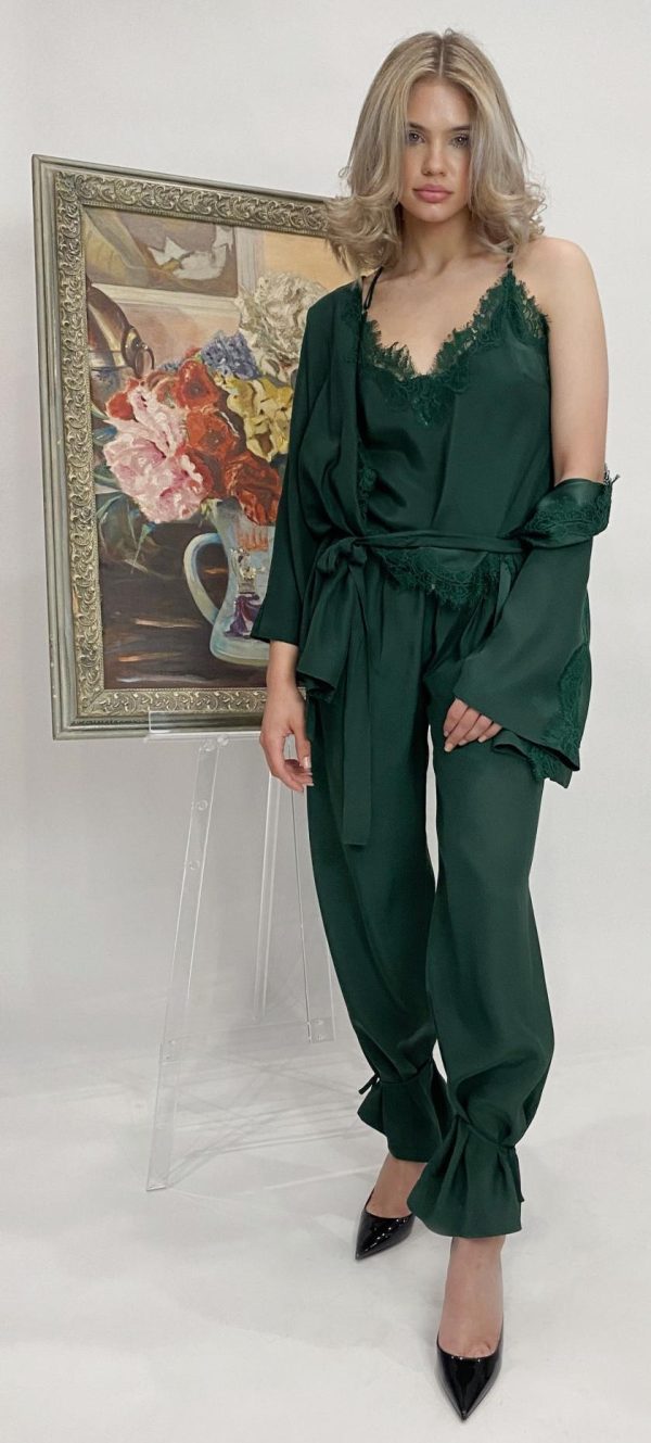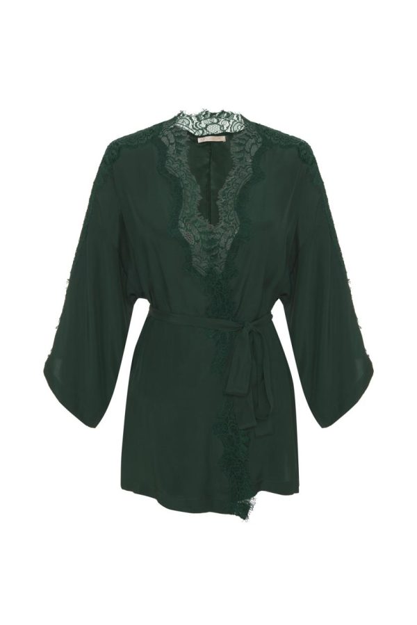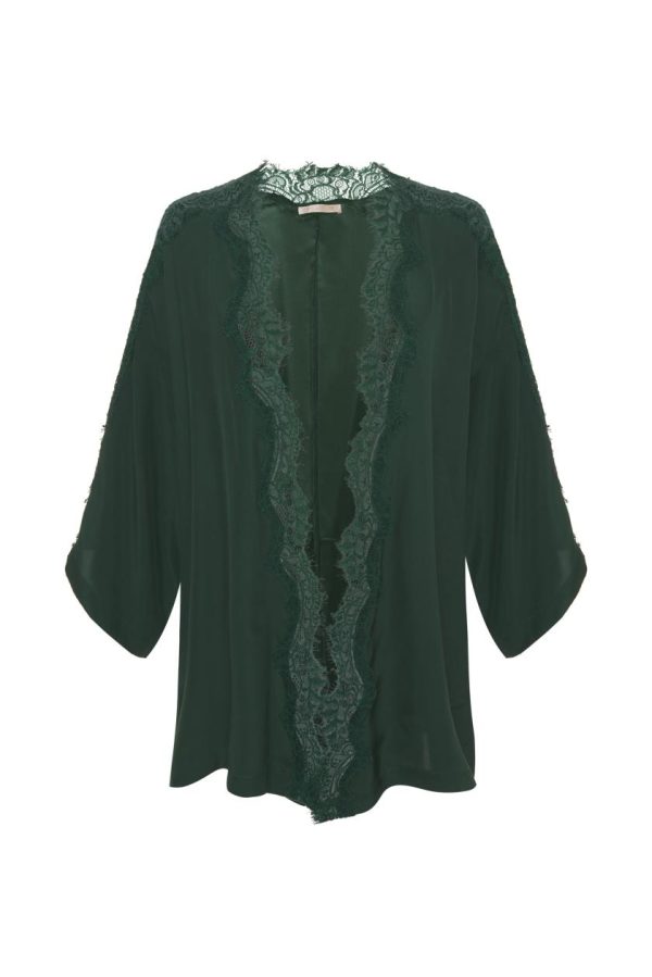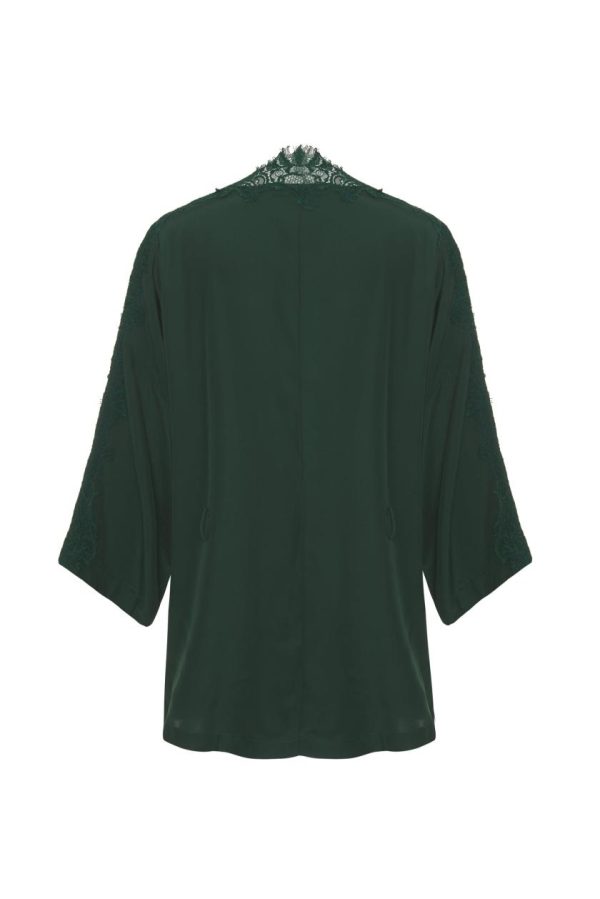 Silk shrug, kimono, or wrap — your choice on how to wear. This shrug drapes beautifully and has a large and long piece of our signature Coco lace that runs from one side of the center front, around the neck, and back down the other side of the center front. This layering piece comes with a matching silk belt to add to the back belt loops, two side seam pockets, and finished with more hand cut lace on the arms.