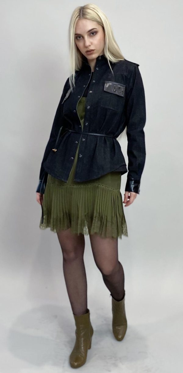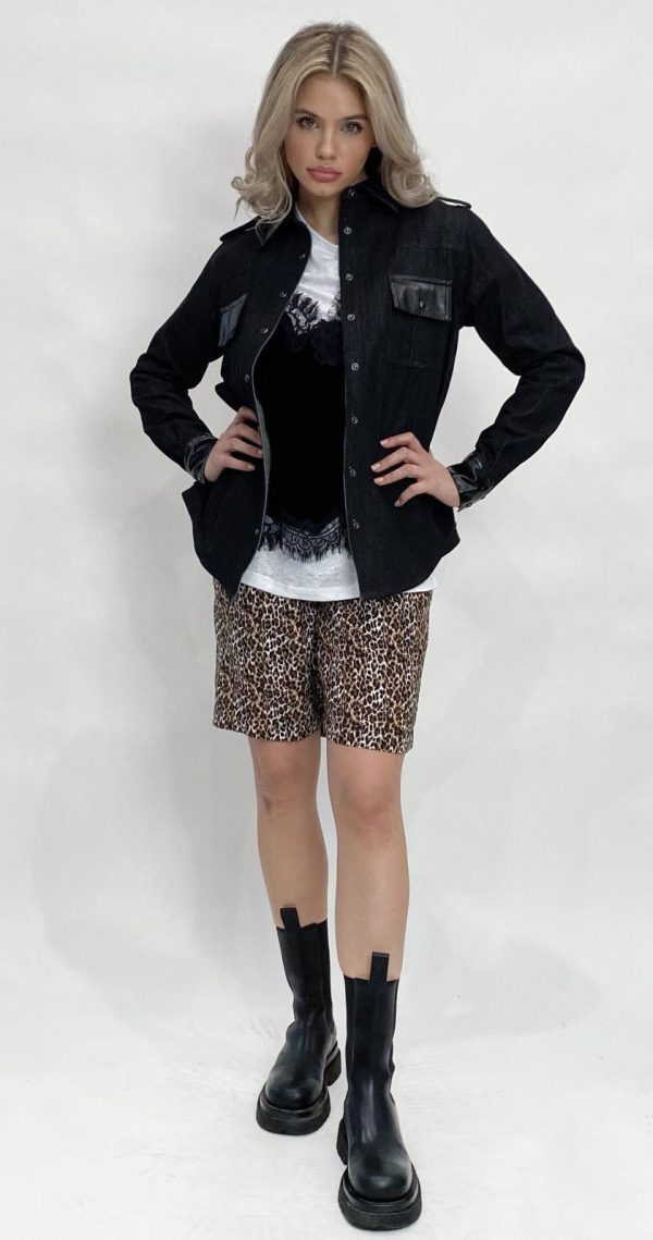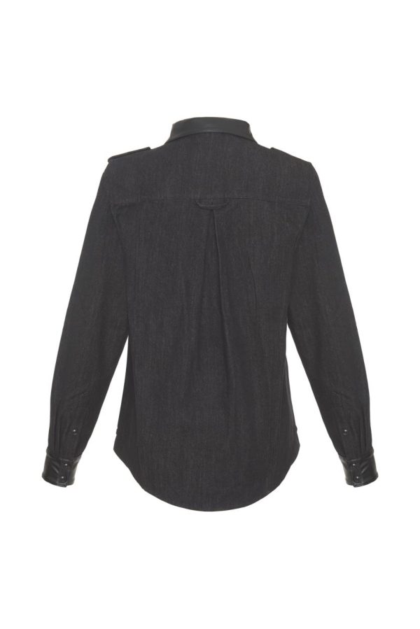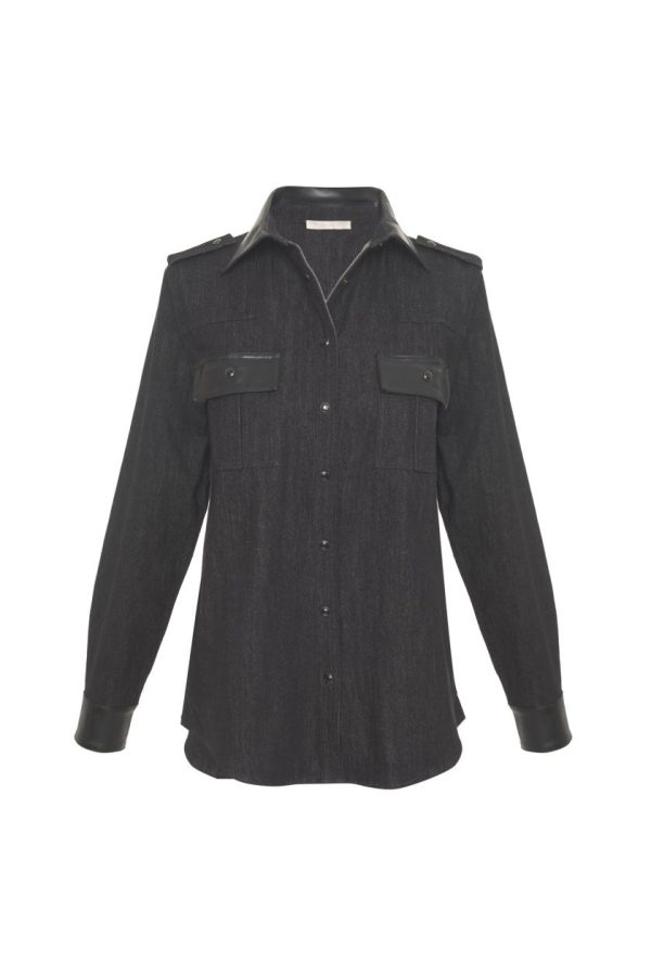 Heavy weight denim shirt jacket trimmed with our super soft and washable faux leather on the flaps, cuffs, and collar. This shirt jacket has snap buttons, two front patch pockets, and shoulder straps.