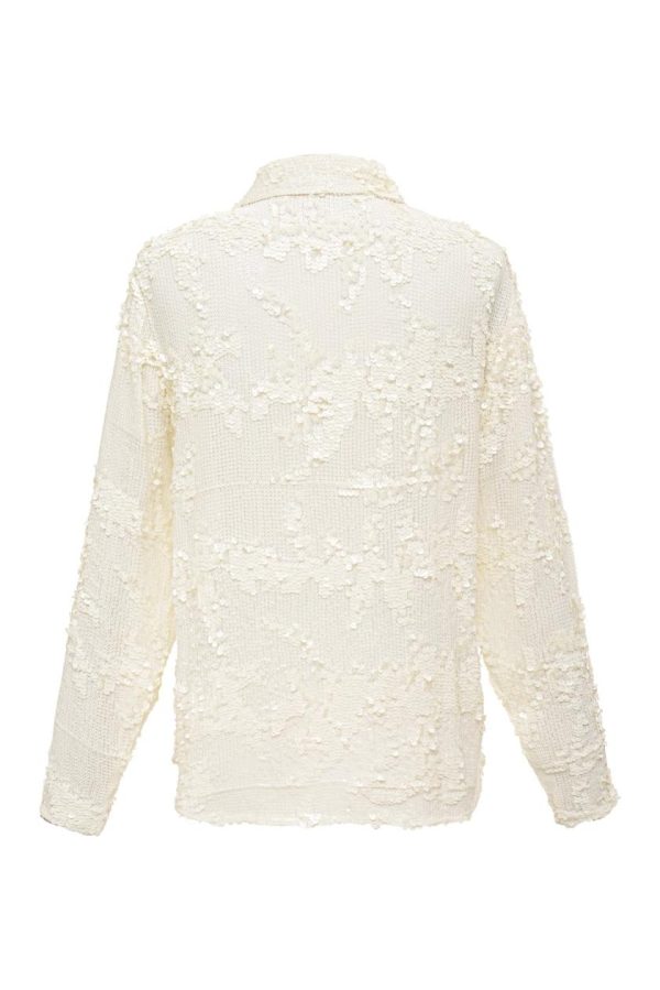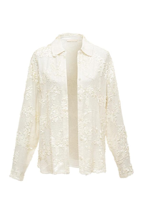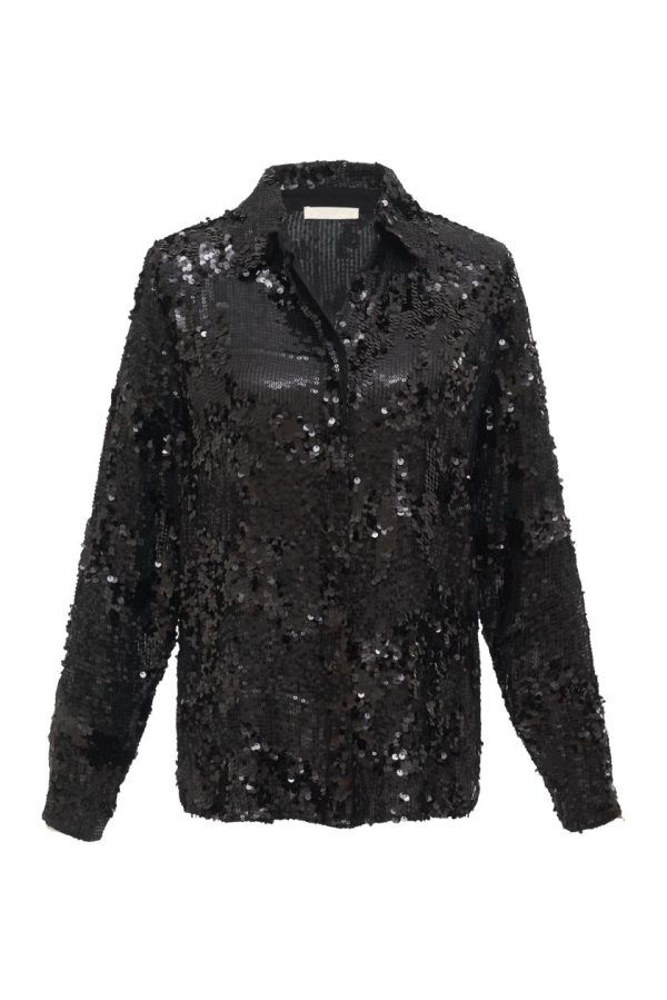 Luxe hand embellished sequins of multiple sizes adorn this classic long sleeve, collared button up top. The blouse’s center front buttons are in a hidden placket. There are no buttons on the cuffs.