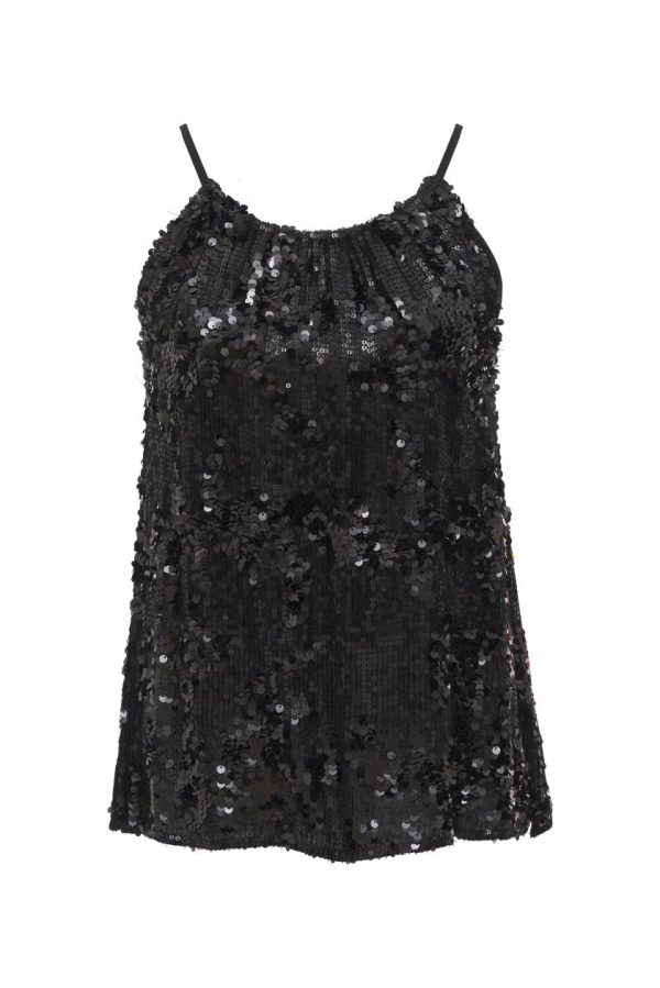 Luxe hand embellished sequins of multiple sizes adorn this halter style camisole. This blouse is lined.