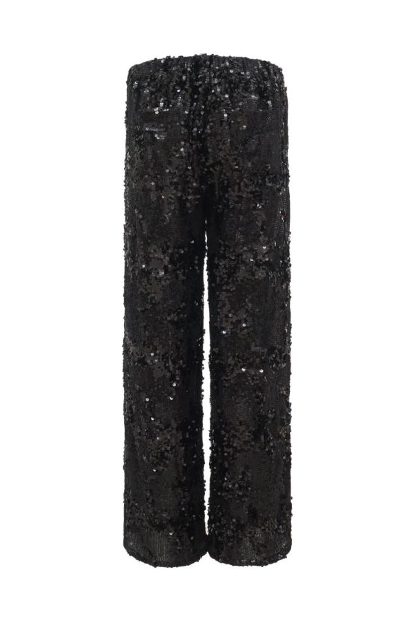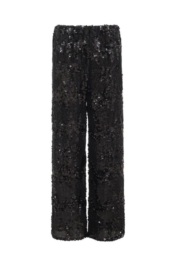 Luxe hand embellished sequins of multiple sizes adorn this pull up wide leg pant. This bottom is lined, has two side seam pockets, two back pockets, and elastic in the waistband.