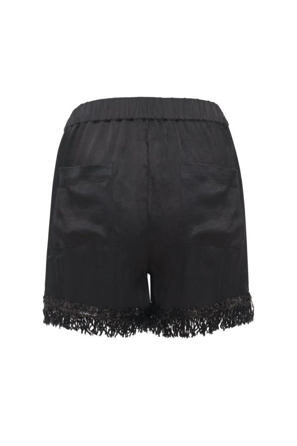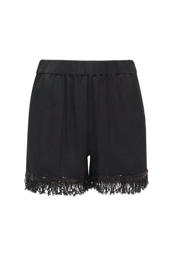Luxe hand embellished sequin fringe adorns this pull up walking short The short is has two side seam pockets, two back pockets, and elastic in the waistband.