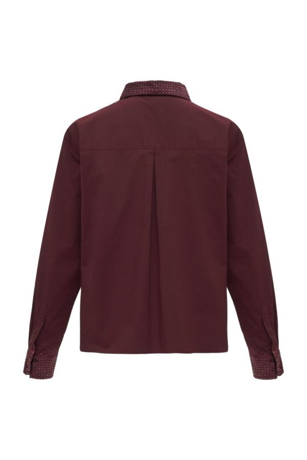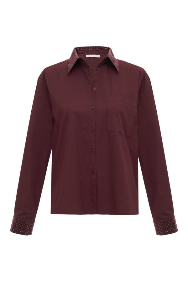 Collared, long sleeve, button up top with functioning buttons on center front, one front patch pocket on the left, button cuffs, and a pleated back. This blouse’s sits at the hips, and it’s collar and cuffs are finished with sparkly, amethyst colored studs in two sizes. Pair this top with a signature Gold Hawk Coco Lace camisole.