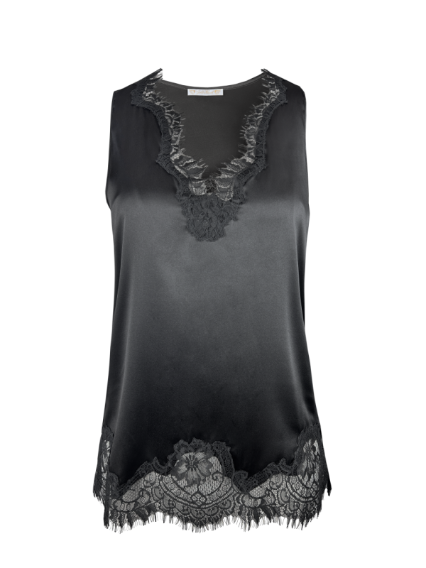 Bias-cut silk V-neck tank with lace detailing on neckline and hem. Bra-friendly design.