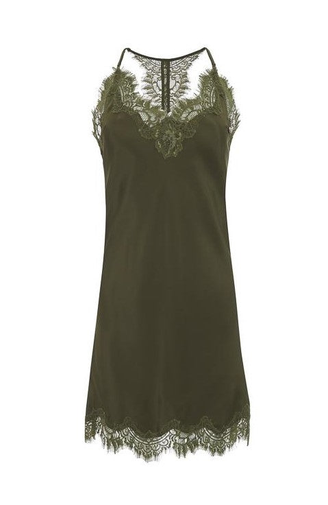 Silk and lace dress with adjustable straps. Lace on upper back, neckline, and hem.